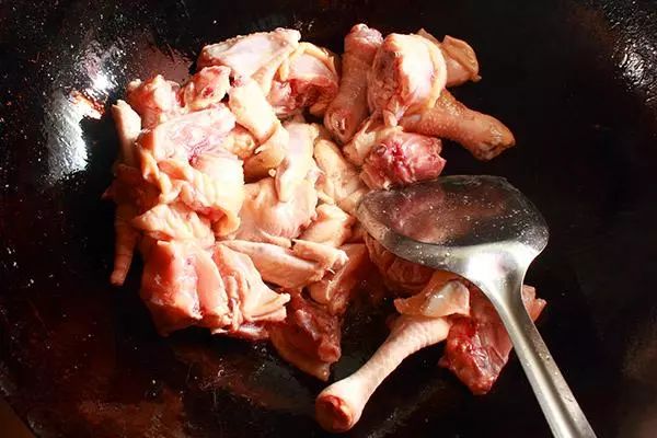 炒锅烧热倒少许油,下鸡块大火炒至八成熟左右,中间淋一些白酒去腥,然后盛出来