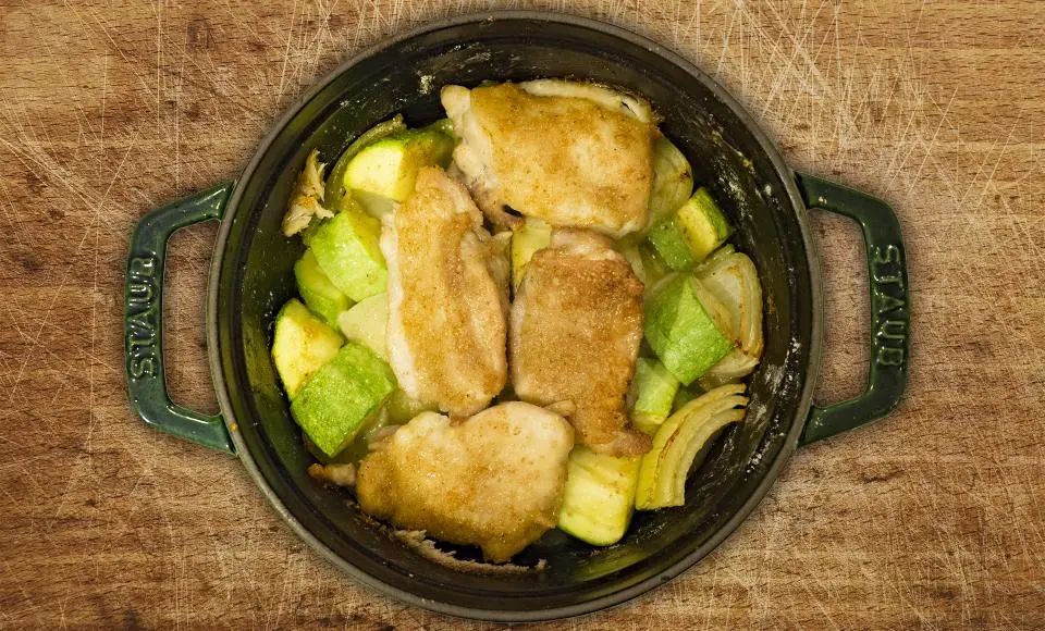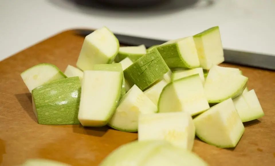 洋葱和脆肉瓜大概三分之一包盐焗鸡粉与之混合。之后再加一点橄榄油Olive Oil混合,放进烤箱。